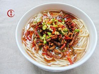 5. 清汤煮熟米粉,捞大碗里,加一碗骨汤,加老抽,鸡精,盐调好,肉丝码上面,再加辣椒末和姜切好的末,葱花,淋一勺开油…