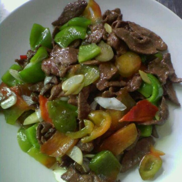净锅添油,先下葱姜蒜爆出香味再下青椒煸炒,添汤定味勾芡淋明油下入猪肝,裹均匀盛盘。