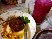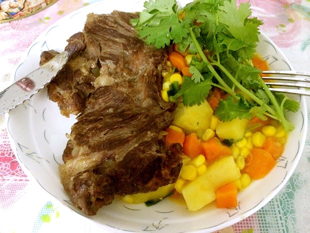 洗干净香菜,把步骤6准备好的配菜和烤好的牛肉装盘,最后淋上步骤7的番茄酱,开吃咯! Yum yum!