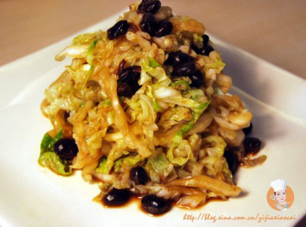 倒入豆豉,放入醋、味极鲜少许、香油、味精(之前白菜已经放过盐了,就不用再放了,豆豉本身也是咸的)