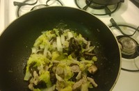 黄芽菜翻炒 再加入香菇木耳粉丝翻炒 最后加入煸好的肉丝 焖3粉钟出锅