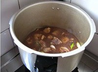 翻炒均匀的猪蹄,放入高压锅,加入与猪蹄齐平的开水,少许盐以及葱姜,桂皮,八角,干辣椒,盖盖上气后再烧15分钟(不用高压锅的话,多加些水大火烧开,小火慢炖一个半小时)