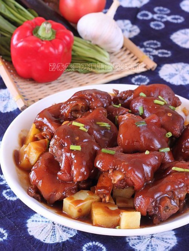 忙忙叨叨懒懒洋洋的这一周又混到周末了~~~东北的冬天彻底的来了,虽然在家里面暖气供应的很足,感觉不到冬天的寒冷,可是望着窗外冬季时常灰蒙蒙的天空,也会让人的心飘过一丝冷意,等到一走进外面的寒风中浑身都会发紧。东北的冬天真的是太冷了,即便是穿着厚厚的羽绒服,皮毛一体的长靴子,将整个脸都包在围巾帽子中,也会感觉到那份冰冷,所以冬天的街上所有的行人都没有了在夏季里慢慢踱步,边走边聊的惬意,所有的脚步都是匆匆忙忙的,因为只要在室外呆得时间长一些,就会觉得身体被冻透了,冻麻木了~~每天早晨一睁开眼睛看见天色还未大亮,老孙就会裹在被子里先怀念一遍夏天的美好再不情愿地起床。每天下班后都会说天真冷呀!所以到了冬天东北人家都会吃些热量高的肉类菜来抵御冬天的寒冷,我家三口本来就是爱吃肉的,到了冬天更是各种肉类都搬到了冰箱里阳台上~~冬天皮肤干燥爱起皱纹,而富含胶原蛋白的猪手就是不错的选择。猪手中的胶原蛋白被人体吸收后,能促进皮肤细胞吸收和贮存水分,防止皮肤干涩起皱,使面部皮肤显得丰满光泽。骨骼生成时,首先必须要合成充足的胶原蛋白纤维组成骨骼的框架,所以胶原蛋白又是“骨骼中的骨骼”。胶原蛋白还可促进毛发、指甲生长,保持皮肤柔软、细腻,指甲有光泽。经常食用猪蹄,还可以有效地防止进行性营养障碍,有利于组织细胞正常生理功能的恢复,加速新陈代谢,延缓机体衰老~~~不过,猪蹄中脂肪含量较高,所以我采用了先卤后蒸的方法让猪手在软烂适口的同时,还能够多一点的去除里面的脂肪,并且加了土豆一起蒸制,和蔬菜结合后吃起来更健康一些,另外用这种蒸扣的方法做出来的成品菜造型也很漂亮,再浇上油亮的汤汁,一端上来马上就会让人眼前一亮~~~