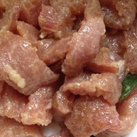 把肉片切成大概手指粗的肉条置盘内,加入适量酱油,料酒,生粉,花生油,拍烂的蒜头和葱头,搅拌均匀,腌制4小时。