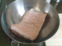 300毫升红酒挤半个柠檬汁加两勺蜂蜜调开,倒在猪肉上。蒙上保鲜膜放冰箱腌制过夜。
