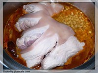 黄豆一杯泡几个小时。猪肘一个,清洗干净,入冷水锅,煮开后关火,洗净脏沫备用。锅热油少许,入葱姜蒜干辣椒,炒香