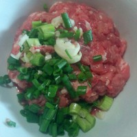 2. 肉剁碎,加入葱倒进萝卜丝里,放适量盐,酱油调味。