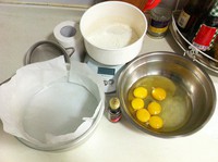 鸡蛋、蛋黄、细砂糖、土蜂蜜、磅好备用,8寸模铺好油纸,锅烧热水(稍微感觉有点烫手即可)