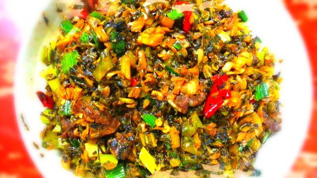 3. 开锅,放入咸酸菜焙干水分,不用放盐了,装盘