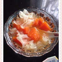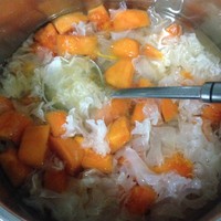 操作:木瓜去皮、切块。洗净双手,银耳用剪刀去蒂,冷水泡软或者开水可以快速泡软,撕成你喜欢的大小,在锅里准备你喜欢的汤水量(我是放多量水),把银耳洗净放入、冰糖适量,盖锅盖,大火煮开3分钟后,转为小火煮30至50分钟,再把木瓜倒入一起煮,继续小火煮,15分钟后搅拌均匀,盛1勺尝一下甜淡如何,可以了就关火,乘热吃;或者冷却后放冰箱冷藏30分钟至3小时均可以。