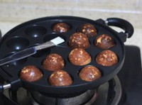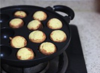 再说小丸子锅,放灶火上,小火,两三分钟,下面就熟了,上面还没熟,轻轻用勺子挖了下,翻个身,再半分钟左右就好了,四周是金黄色,向上一面是嫩黄色。6连马芬是送进烤箱烤的,170度,中层,25分钟左右