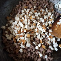 待猪油渣变至金黄倒入腌好的肉丁翻炒.