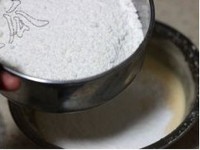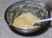 筛入低筋面粉、泡打粉、香草精的混合粉。另把黄油隔热水融化