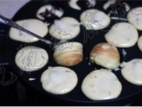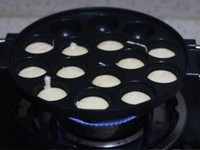 中小火加热,舀完一圈,就正好开始放入豆沙,每窝里放1小块(1小勺左右吧)