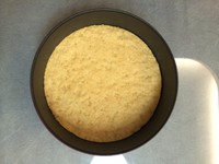 将烤箱预热至160度,将6放入烤箱中层,上下火烘烤15~17分钟,烤至淡淡的黄褐色取出。稍加冷却,然后将脱模刀插入蛋糕底与模具之间,转动脱模刀使蛋糕底与模具之间出现缝隙,紧贴模具内侧将垫纸插入缝隙中垫好。我因为用的不粘模,就没有用围边的垫纸,只稍稍的松动了一下蛋糕底。