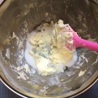 搅拌过程中发现有小颗粒出现,就用刮刀抵住盆壁碾碎,小颗粒会影响口感。直到奶酪糊变得顺滑。