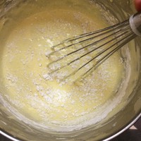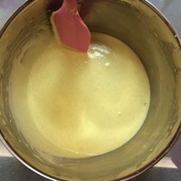 将全蛋和蛋黄打散后分3次倒入材料中,每加一次要搅拌30秒左右,让材料裹入空气,然后再加蛋液。