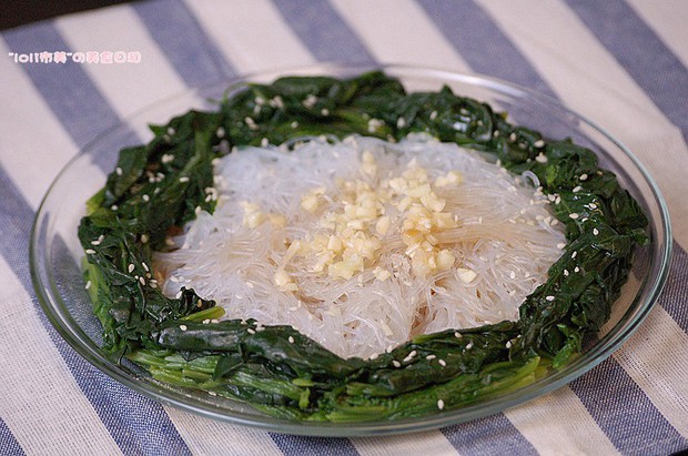 3. 将粉丝放入盘中,菠菜段儿围绕着粉丝摆成一圈,调入芥末油、鸡精、盐、白糖、米醋和香油,撒上大蒜末和白芝麻,吃的时候拌匀即可~