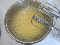 将打蛋盆拿出,用电动打蛋器打至起大泡,蛋液为黄色。