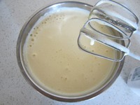 继续用打蛋器搅打约5分钟,至蛋液膨胀,颜色变成淡淡的乳黄色。