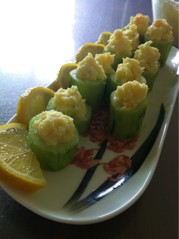 8. 把土豆填充到黄瓜的中心去。