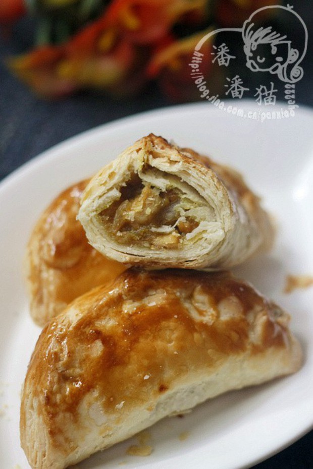 今天上的这款点心是我做过的最最受欢迎的一款酥皮点心,俺爷爷都很喜欢。也许因为它是咸的,吃了不会感觉腻口,也许因为里面有肉,呵呵~