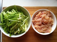 先将芹菜洗净切段,鸡肉洗净切条状。干辣椒切小段,蒜压扁。米粉先用水浸泡半小时