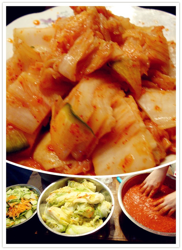 将白菜竖着切“十”字,成四瓣,用盐将白菜涂抹均匀进行腌渍,(用硬物压在所腌白菜上),腌渍时间大约为1-2天,其中半天翻一次将白菜完全腌倒