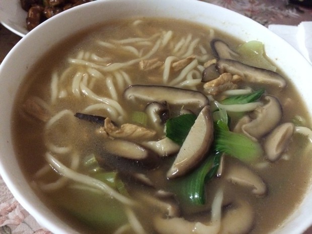 大火热锅,倒一点油烧热,放肉、香菇、葱,翻炒几下,放适量酱油,接着往锅里倒水,水开后下面条,同时尝尝汤的味道,可以继续补充调料,放盐、酱油、黑胡椒。最后放油菜。这样一碗鲜美的汤面就好了,因为放了香菇,味道很好。
