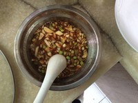 在煎茄子期间,可以准备下汤料。两勺豆瓣酱,两勺蚝油,一勺酱油,一勺料酒,一勺香油,半勺糖,些许盐,把蒜末葱末放一些进去。加水搅拌均匀。调理可以根据自己的口味增减的