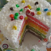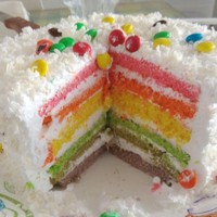 将冷藏后的奶油打发后,依照一层蛋糕一层奶油的顺序盖好蛋糕,依次为紫色、蓝色、青色、绿色、黄色、橙色、红色蛋糕体。排好后,摸匀一层奶油。