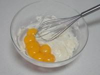③再加入100g鸡蛋黄,用打蛋器搅拌均匀;