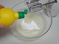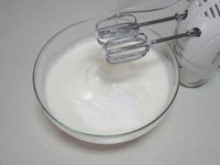 然后倒入27g细砂糖(及淀粉),再滴入几滴柠檬汁,中速搅打至蛋白体积膨大一倍,再加入27g;