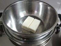 ①先把100g白巧克力放入容器里,再放到蒸锅上,加热至融化的状态。