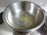 ②把盛有雪碧的容器放到蒸锅上加热,然后将已经用冷水泡软的吉利丁片,放入雪碧里。