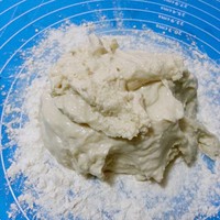面醒好以后开始做肉饼:案板上撒一些薄面,手沾点水(可以防粘手),从盆里揪一块面放到案板上