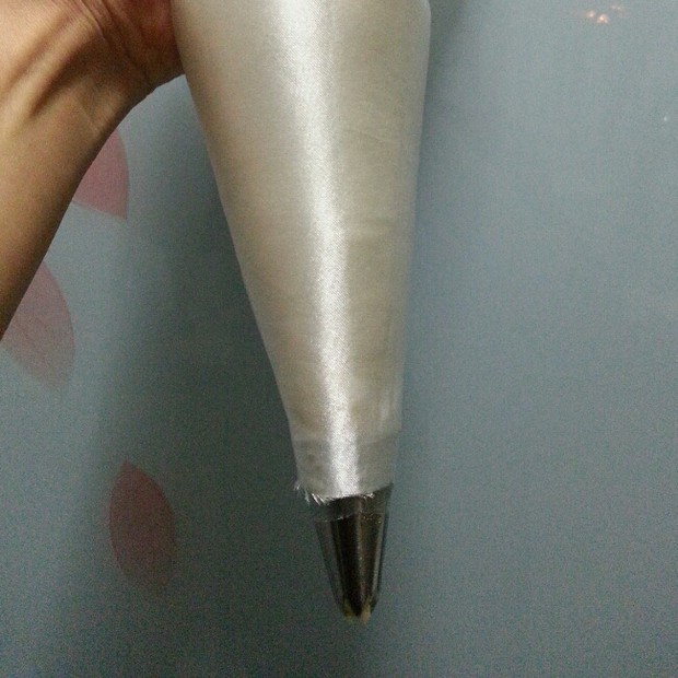 找块结实的布车缝个跟裱花袋大小差不多的袋子,前端别忘了留出口(裱花袋是旧的拍照清楚)。我用的是美丽绸,好洗不抽结实。