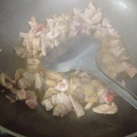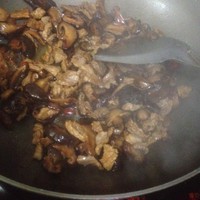 先将蒜和辣椒煸炒起香味,在放入瘦肉煸炒到金黄色,此时可以开始放调味料根据个人喜欢适量,记得一定要现在放,待会放的话焖香菇会很咸