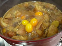 加红烧酱油、冰糖、蚝油将猪脚炒上色,冲入开水,放入几粒金桔一起煮,金桔的数量不可太多不然回口会苦。