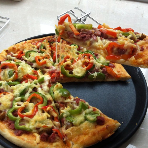 一、我这个只是用部分尖椒来给出辣味,嗜辣的亲可以以辣酱替代披萨酱,尖椒替代青椒哦~二、腊香肠替换牛肉就是真的腊味香肠披萨哦~
