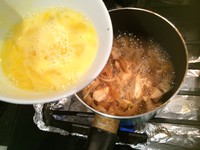 鸡蛋打散(稍微打一下就可以了,不需要打的太均匀),加入蛋液,盖上锅盖,焖煮约15秒后熄火(若不喜欢鸡蛋太生,可再多焖一会儿)