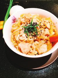 第一次吃“丼”饭的时候,是朋友跟我说走我们吃丼饭去,弄了半天没有明白这个字。这个“丼”,在表示日式盖饭时念“dong”,四声。这个字其实从英文转过来的,因为日式菜单上都是写的don.一直都不明白为什么叫做“亲子丼”,也不明白鸡肉和鸡蛋的组合为什么叫“亲子”,原来鸡肉是“亲”,鸡蛋是“子”就这么简单。在日式盖饭的悠久历史里,这款“亲子丼”堪称始祖,它诞生于明治年间,有100年以上的历史。以前是做成将蛋汁淋在鸡肉上的料理,后来由于鸡蛋价格昂贵,客人们舍不得料理的汤汁,就将米饭拌入汤汁一起食用,后来就慢慢演化成鸡肉蛋汁盖饭,也就是“亲子丼”了。其实丼不单单只有鸡肉,也有牛肉的,豆腐的。虽说是日式盖饭的始祖,但制作起来十分简单。从原料到调料,直至整个烹饪过程,只是简单的切配和煮制,没有需要耐心细致的繁琐步骤,十分适合厨房新手。由于主料是鸡肉和鸡蛋,都是十分易熟的材料,所以烹煮时间只需要十分钟左右,也十分适合忙碌的人们。小孩子也特别喜欢。做的是照烧口味的,可以直接用现成的照烧汁。