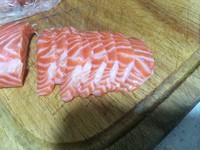 三文鱼用快刀片成窄长的薄片,不要像刺身一样太厚。