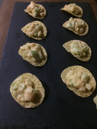 原味薯片挑选齐整的,用小勺子舀一勺沙拉,再放水三文鱼片。OK,上桌!