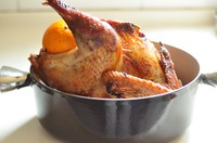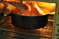 火鸡腿用粗棉线捆起来防止烤完了四仰八叉,鸡翅部分我也适当捆扎。香草蜂蜜黄油涂抹火鸡身体,火鸡屁股用橙子塞住防止露馅。鸡腿处裹锡纸防止糊,180度3小时。