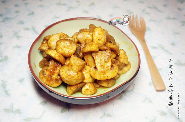 翻炒到蘑菇出水,加适量盐翻炒后加一大勺辣椒粉一大勺咖喱粉,炒至汁水收干就可以啦。友情提醒下:大家可以先少一点辣椒粉和咖喱粉,尝了味道再添加..口蘑不是很容易入味所以先加点盐,建议重口味一点更好吃~~~