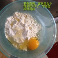 茄子准备好之后,开始准备面糊,取面粉倒入盆里,加入鸡蛋,注意其他任何调料都不加,加入水搅拌,粘稠度以能把面糊粘到茄子上为好,不能太稠,不然炸出来的茄子面粉太厚,影响口感!