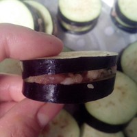 把调好的肉末包进茄子里面,不要放太多肉,不要放太多不然会露出来,把茄饼压匀即可