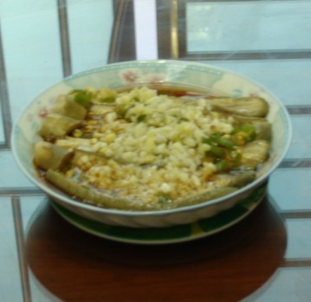 7. 锅里加食用油、芝麻油烧至8分热,淋在蒸好的茄子上