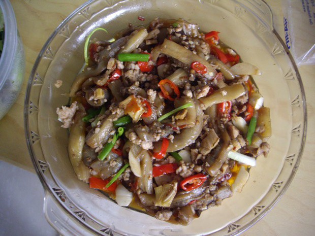长茄子削皮后切条,蒸熟。蒸的过程中盘子里会有不少水渗出,倒掉继续蒸,直到茄子蒸熟为止。软硬程度依照个人情况而定。